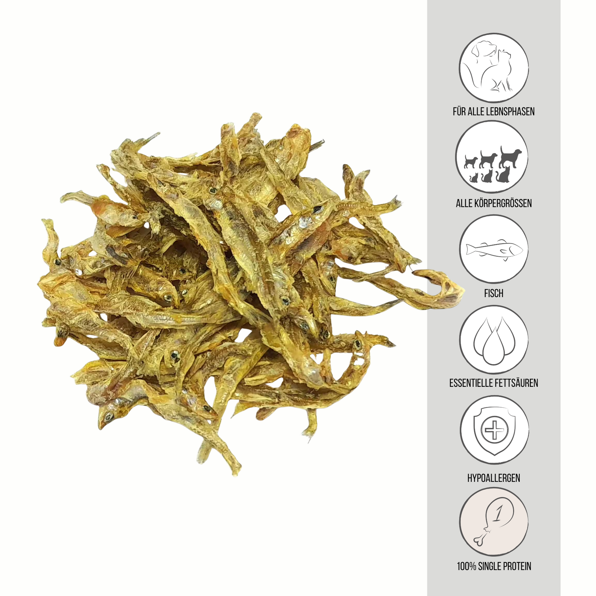 PERRO Crunchy Fischsnack Stinte sind kleine, getrocknete Fische und sowohl bei Hunden als auch Katzen sehr beliebt. Der Stint ist ein Meerwasserfisch aus der Klasse der Knochenfische. Stinte sind Meeresfische, die bevorzugt in Küstennähe leben und stellen einen beliebten Speisefisch dar. Die knusprig getrockneten, kleinen Fische von etwa 5 cm Länge eignen sich für jede Körpergröße, da sie leicht in kleine Portionen geteilt oder auch als Ganzes verfüttert werden können.