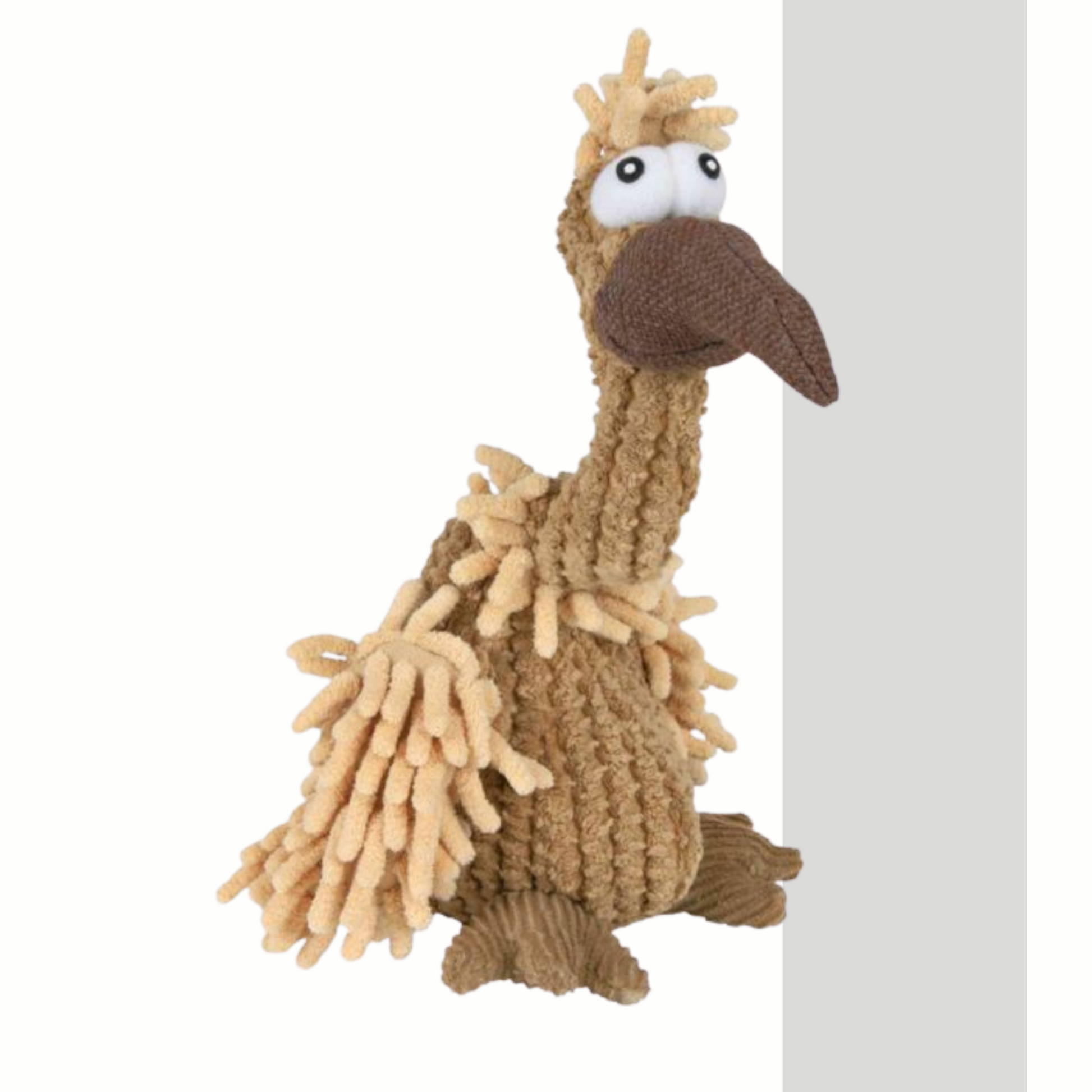 Der zottelige Geier ist ein robustes Stofftier mit großen Kulleraugen und Quitschi Bauch!