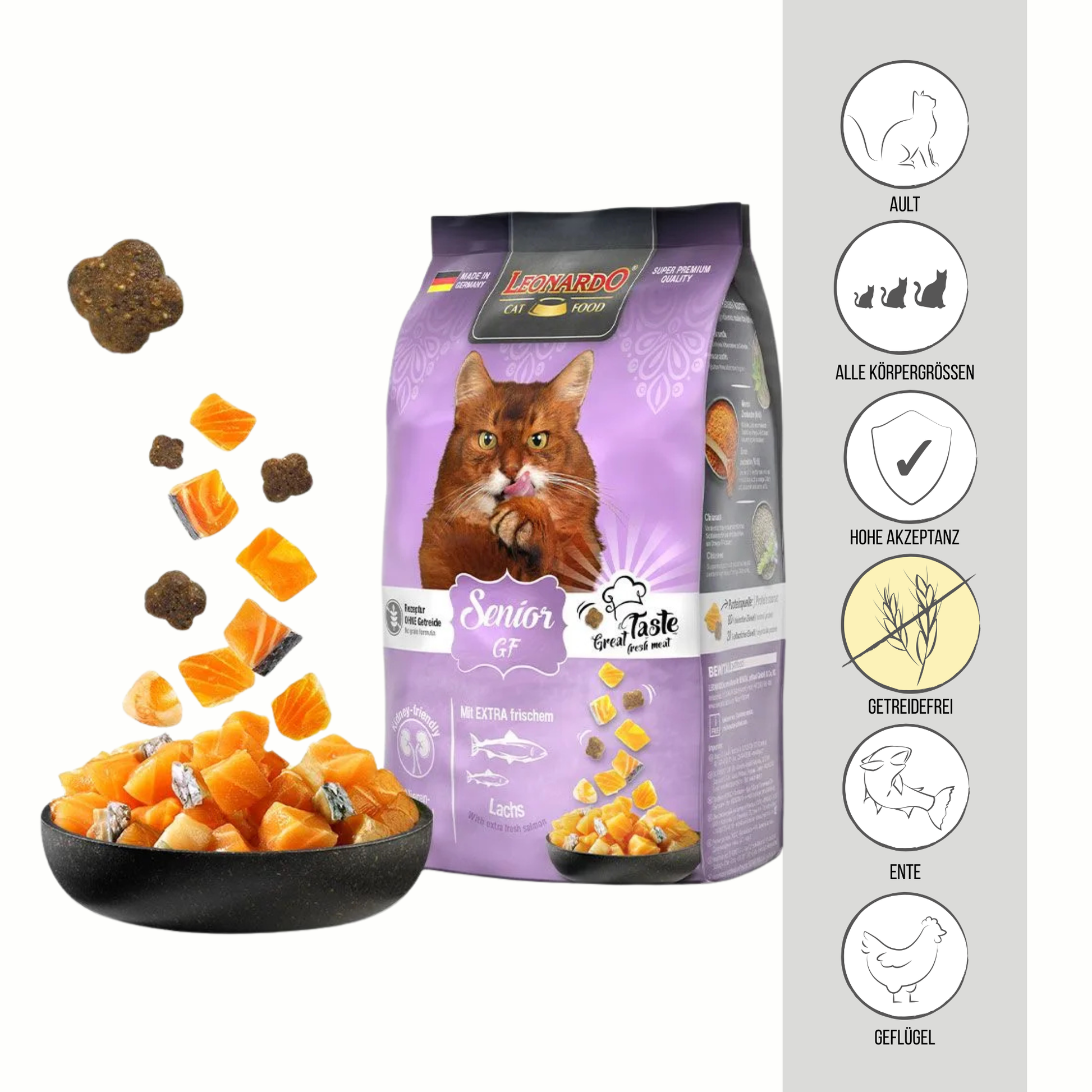 Alleinfuttermittel für ältere Katzen ab dem zehnten Lebensjahr mit Getreideunverträglichkeit