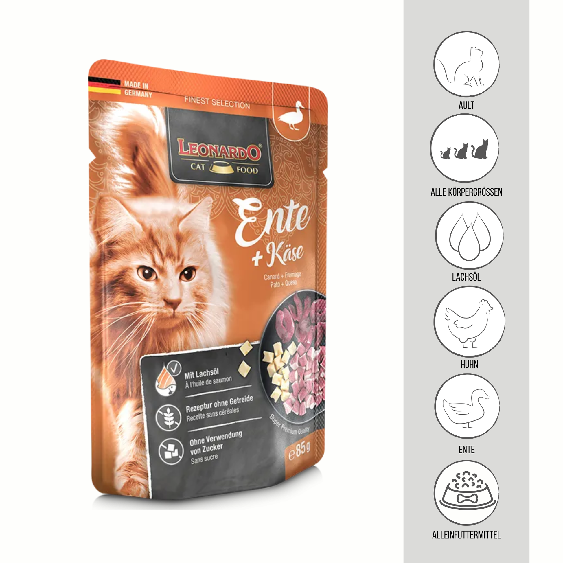Das gewisse Extra: Ente sorgt für viel Geschmack im Napf und Käsewürfel bieten eine ganz besonders herzhafte Überraschung. Mit wertvollen Omega-3-Fettsäuren steigern sie zudem das Wohlbefinden unserer vierbeinigen Lieblinge. Ein weiteres Plus von LEONARDO Ente + Käse: weiches und glänzendes Fell – dank mehrfach ungesättigter Fettsäuren aus Lachsöl.
