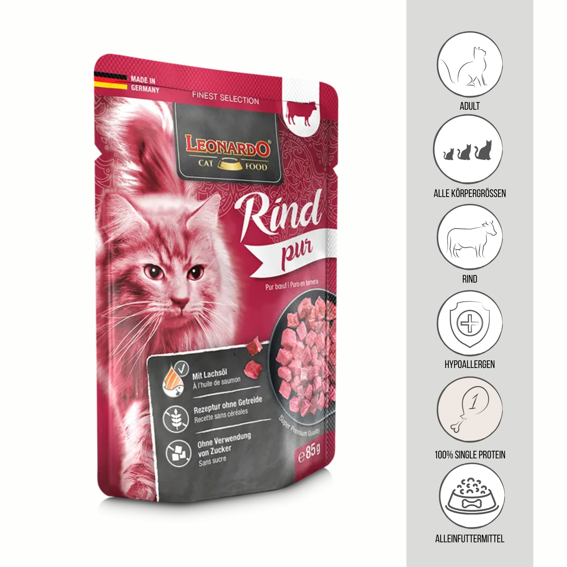 Saftiges Fleisch wird harmonisch verfeinert und schonend im Portionsbeutel (85g) gegart. Die erlesenen Rezepturen basieren auf hochwertigen regionalen Rohstoffen. Natürliches Lachsöl liefert mehrfach ungesättigte Fettsäuren und ist reich an Omega-Fettsäuren. Diese fördern eine gesunde Haut und ein glänzendes Fell. Das unwiderstehlich schmackhafte Nassfutter ist zucker- und getreidefrei. Auf dem Grund der unterschiedlichen und hochwertigen Zutaten wie Rind, Lamm, Ente, Geflügel, Kalb, Känguruh, Kaninchen, Forelle, Fisch und Shrimps kommt jeder Vierbeiner auf den Geschmack. Zusätzlich wird das Futter durch Cranberries, Katzenminze, Ei oder Käse aufgewertet.