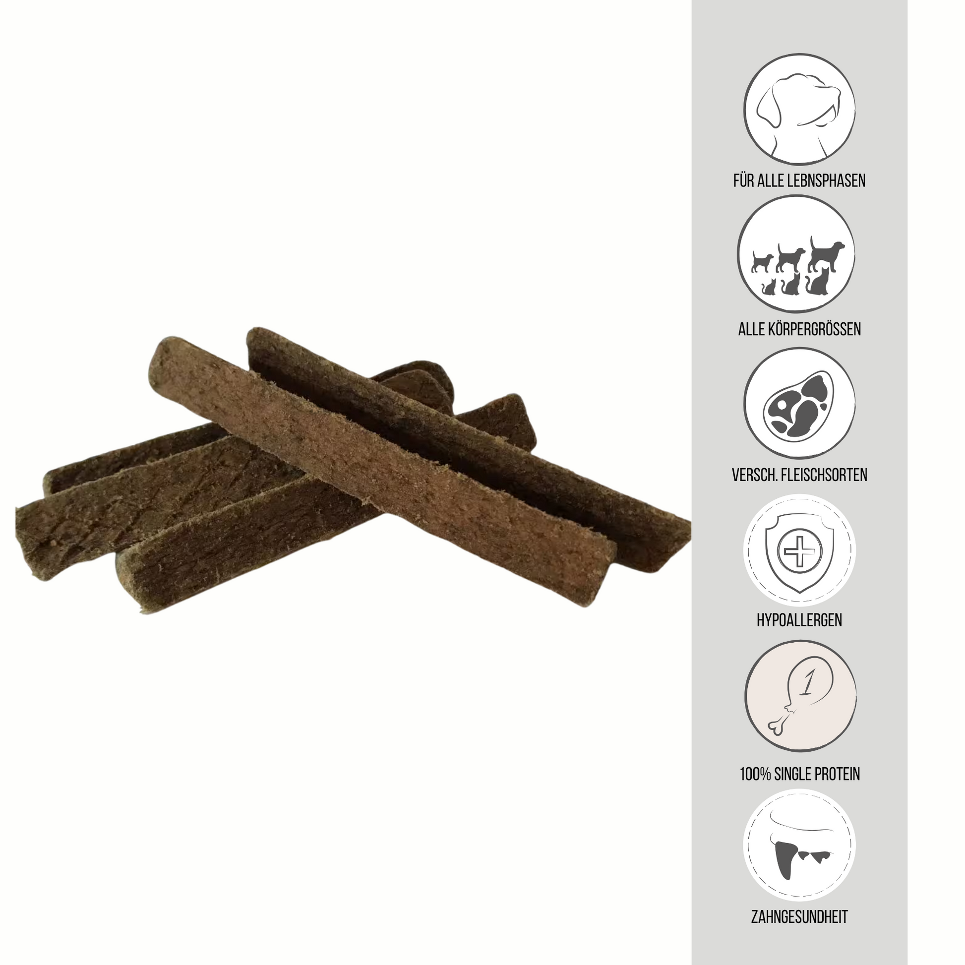 PERRO Dentrix ist ein hochwertiger Snack zur Unterstützung der Zahnpflege. Er wird aus viel frischem Fleisch, in 3 köstlichen Sorten hergestellt. Die Zutaten werden zerkleinert, vermischt und kalt in die spezielle Dreiecksform gepresst. Diese Dreiecksform und die einzigartige elastische, Konsistenz tragen zur Reduzierung des Zahnbelages bei und beugt so Zahnstein vor. Hefeextrakt unterstützt das Immunsystem, die Neigung zu Zahnfleischentzündungen kann dadurch verhindert werden. Das besonders schonende Trocknungsverfahren garantiert die Erhaltung wertvoller Inhaltsstoffe.