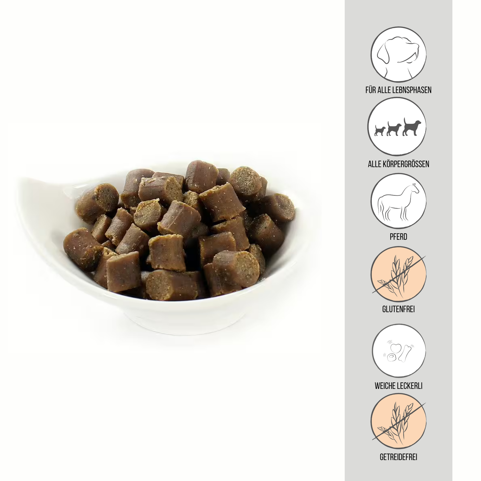 PERRO Kartoffel Softies Pferd sind kleine, weiche Belohnungshappen für den Hund. Sie eignen sich durch Größe und Konsistenz besonders gut als Trainings-Leckerli oder als kleiner Snack zwischendurch. Die Belohnung ist nicht nur getreidefrei und glutenfrei, durch den hohen Fleischanteil haben sie auch eine ausgesprochen hohe Akzeptanz. Selbstwählerische Hunde sind davon begeistert. Die Kombination aus Kartoffel mit Geflügel- und Pferdefleisch macht es möglich, auch sinnvollere Hunde damit zu belohnen. Der Fettgehalt ist mit unter 5 % für einen Snack sehr niedrig.