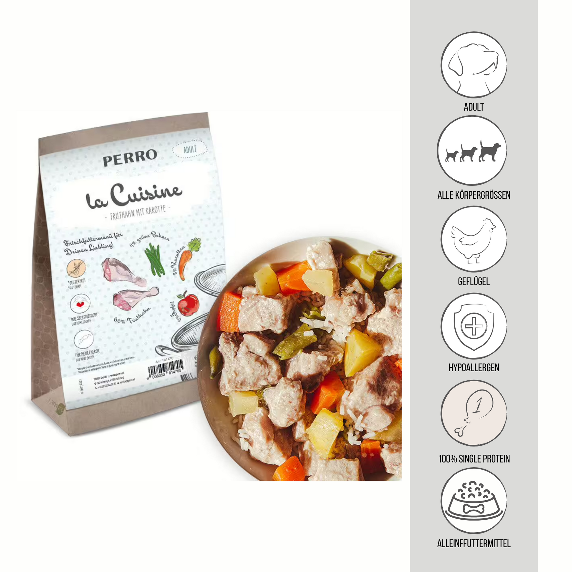 Viele Hundebesitzer würden für ihren Liebling gerne Mahlzeiten selbst zubereiten, doch dafür fehlt ihnen einfach die Zeit. Es muss also eine praktische und einfache Lösung her! Mit La Cuisine haben wir ein Frischfuttermenü kreiert, das genau diesem Anspruch gerecht wird. Hochwertige, möglichst regionale und frische Zutaten vereint in einer ausgewogenen und vollwertigen Mahlzeit.