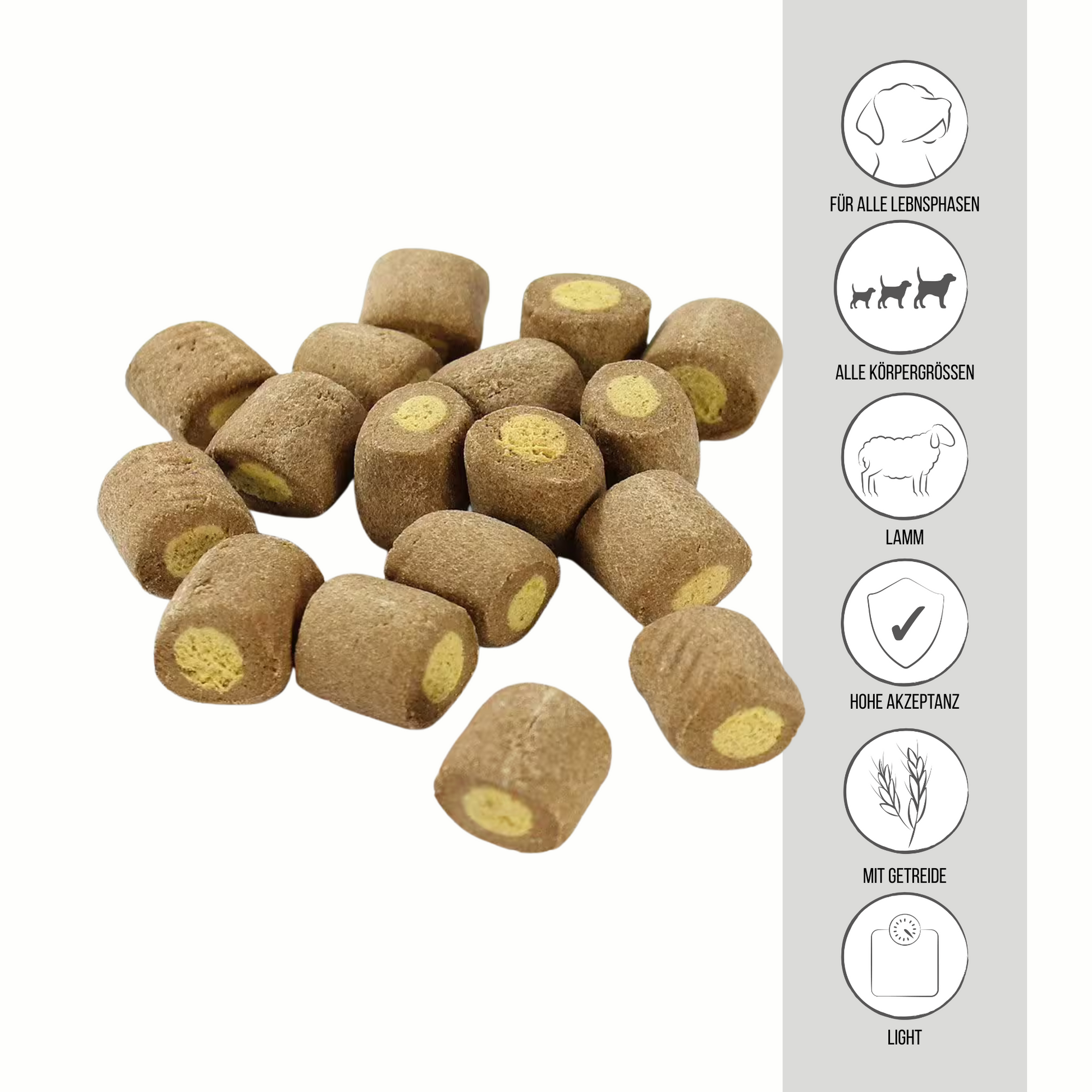 Die knusprigen, gebackenen Hundekekse mit leckerem Lammfleisch begeistern den Hund durch den besonders herzhaften Geschmack. Wertvolles Getreide und wenig Fett machen diesen Snack zur idealen Belohnung für zwischendurch. Die Kekse sind ca. 2 cm groß und besonders knackig. Lamm ist auch bei wählerischen Hunden sehr beliebt.
