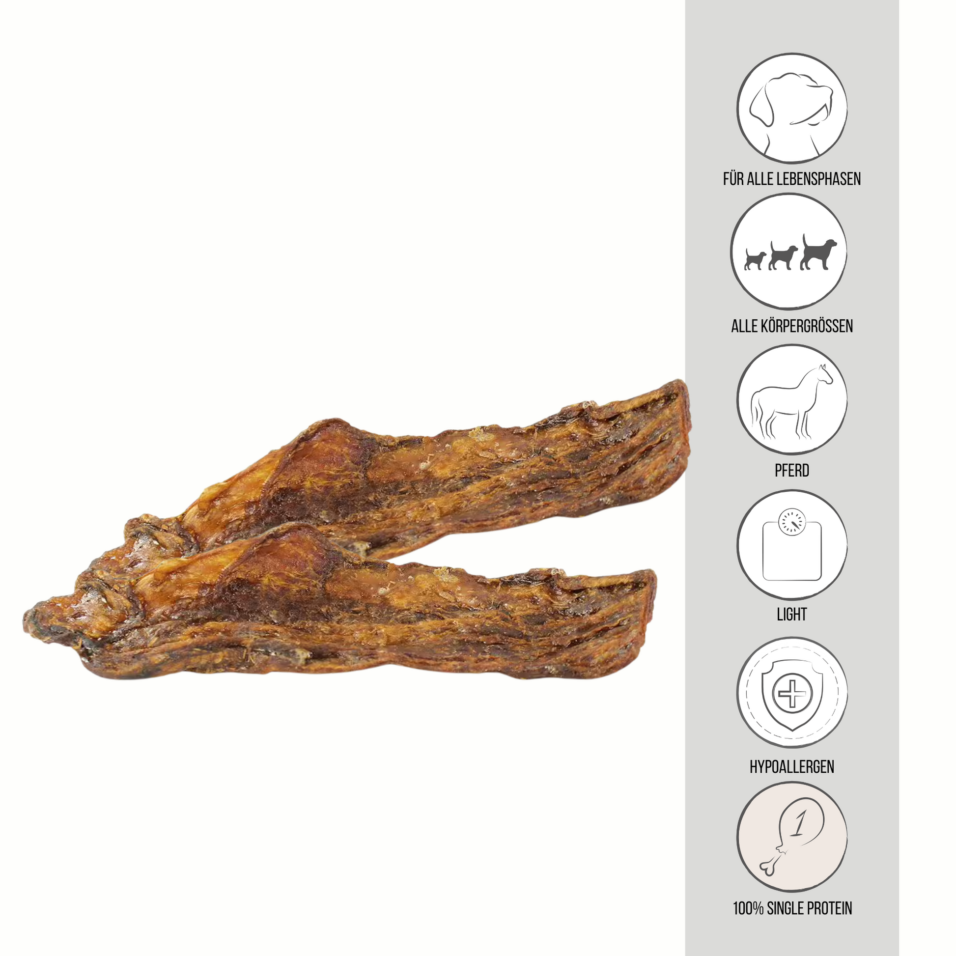 PERRO Pferdedörrfleisch sind leckere, weiche bis mittelharte Streifen aus 100% Pferdefleisch . Die feinen Streifen sind leicht zu kauen und daher auch für Welpen beim Zahnwechsel oder ältere Hunde ideal geeignet. Dieser Singleproteinsnack ist eine besondere Delikatesse speziell auch für Hunde, die an Allergien und Unverträglichkeiten leiden. Durch eine feine Glasur aus Malz und Mineralstoffen wird die Akzeptanz zusätzlich gesteigert – selbst wählerische Hunde werden begeistert sein! Die perfekte Abwechslung im Rahmen einer selektiven Ernährung.