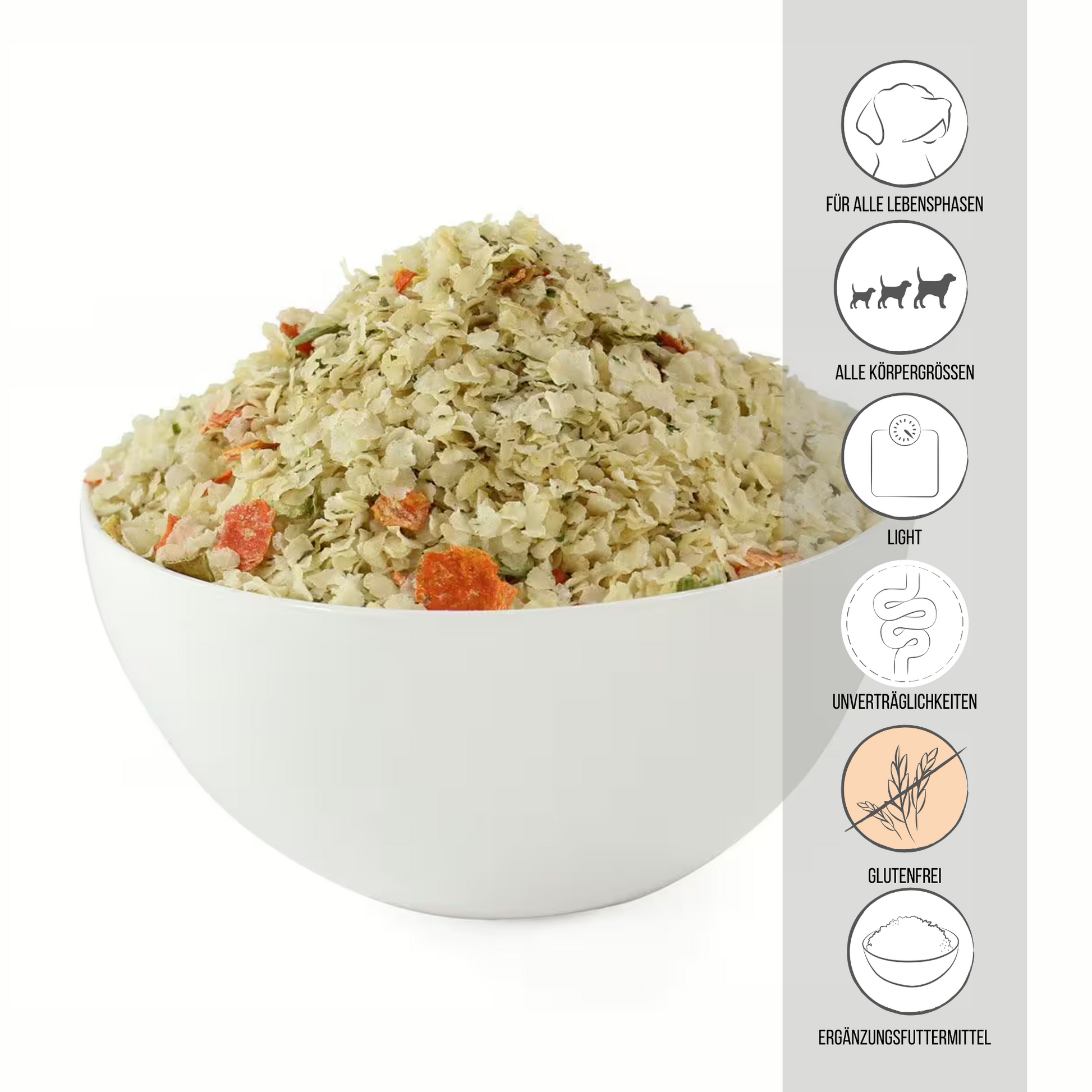 PERRO Reisflocken mit Gemüse sind die optimale Ergänzung zu unseren 100%igen Fleischprodukten PERRO Premium Pur Nassfutter . Du erhältst dadurch ein speziell auf Deinen Hund abgestimmtes Futter !
