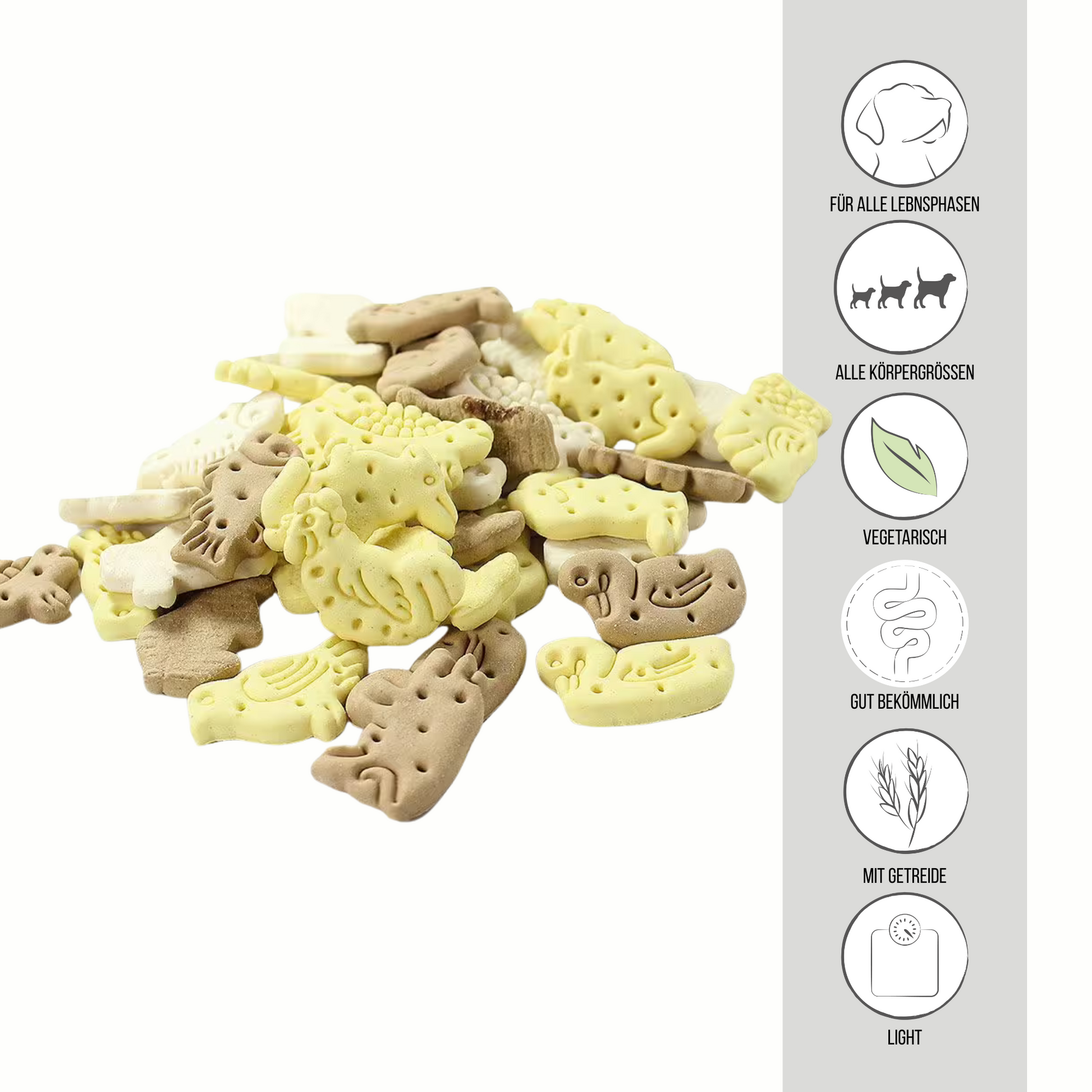 Perro Zoologika sind leckere, vegetarische Hundekekse in lustigen Tiermotiven. Besonders die jungen Hundelhalter haben große Freude, ihre vierbeinigen Freunde mit den leckeren Tierfiguren zu belohnen. Für kleinere Hunde kann das Leckerlie gut in kleinere Stücke gebrochen werden. Das leichte Vanillearoma der Kekse ist bei fast allen Hunden sehr beliebt und verzichtet in der Rezeptur auf Fleisch.
