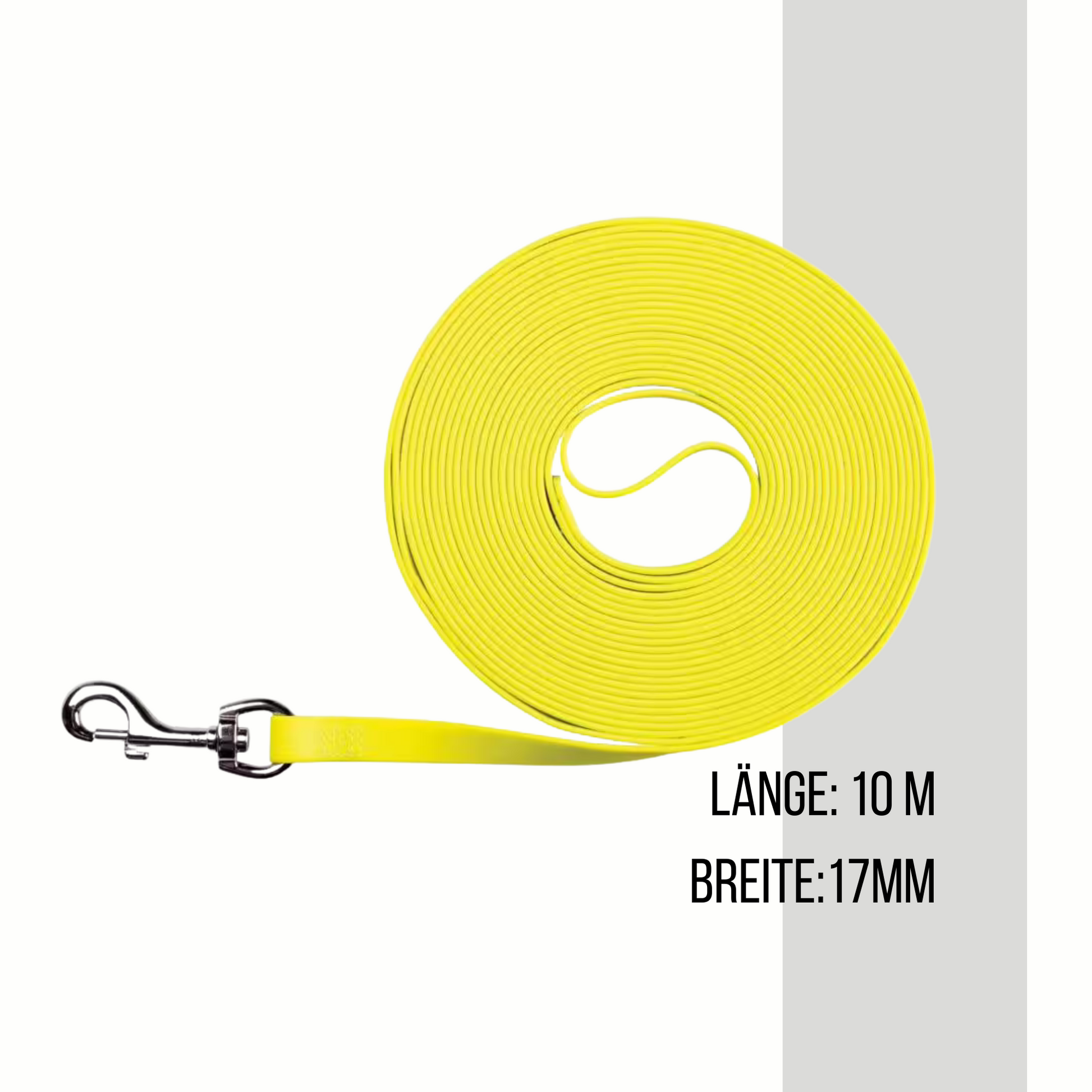 Schleppleine aus Gurtband mit Kunststoffmantel mit Handschlaufe gut sichtbare Neonfarbe 10m x 17mm Easy Life Schleppleine neongelb Die wasserabweisenden Kunststoff-Hundeleinen von Trixie liegen besonders gut und sicher in der Hand. Der Hund erhält durch die lange Leine mehr Bewegungsfreiheit. Sie eignet sich ideal zum Trainieren von Kommandos auf Distanz, als Schleppleine oder Suchleine z.B. in der Personensuche (Mantrailing) oder im Jagdeinsatz (Fährtenarbeit / Nachsuche).Die Hundeleine ist einfach zu reinigen, da die Kunststoff-Oberfläche wasser- und schmutzabweisend ist. Nach Gebrauch kann sie entweder mit Wasser abgespült, oder mit einem Tuch abgewischt werden. Um den Hund sicher halten zu können ist die Leine mit einer stabilen Handschlaufe ausgestattet. Die Schleppleine ist durch die Neon - Farbe besonders gut sichtbar. Gurtband mit PVC ummantelt mit Handschlaufe liegt sicher in der Hand gut sichtbare Neon - Farbe wasserabweisend leicht zu reinigen