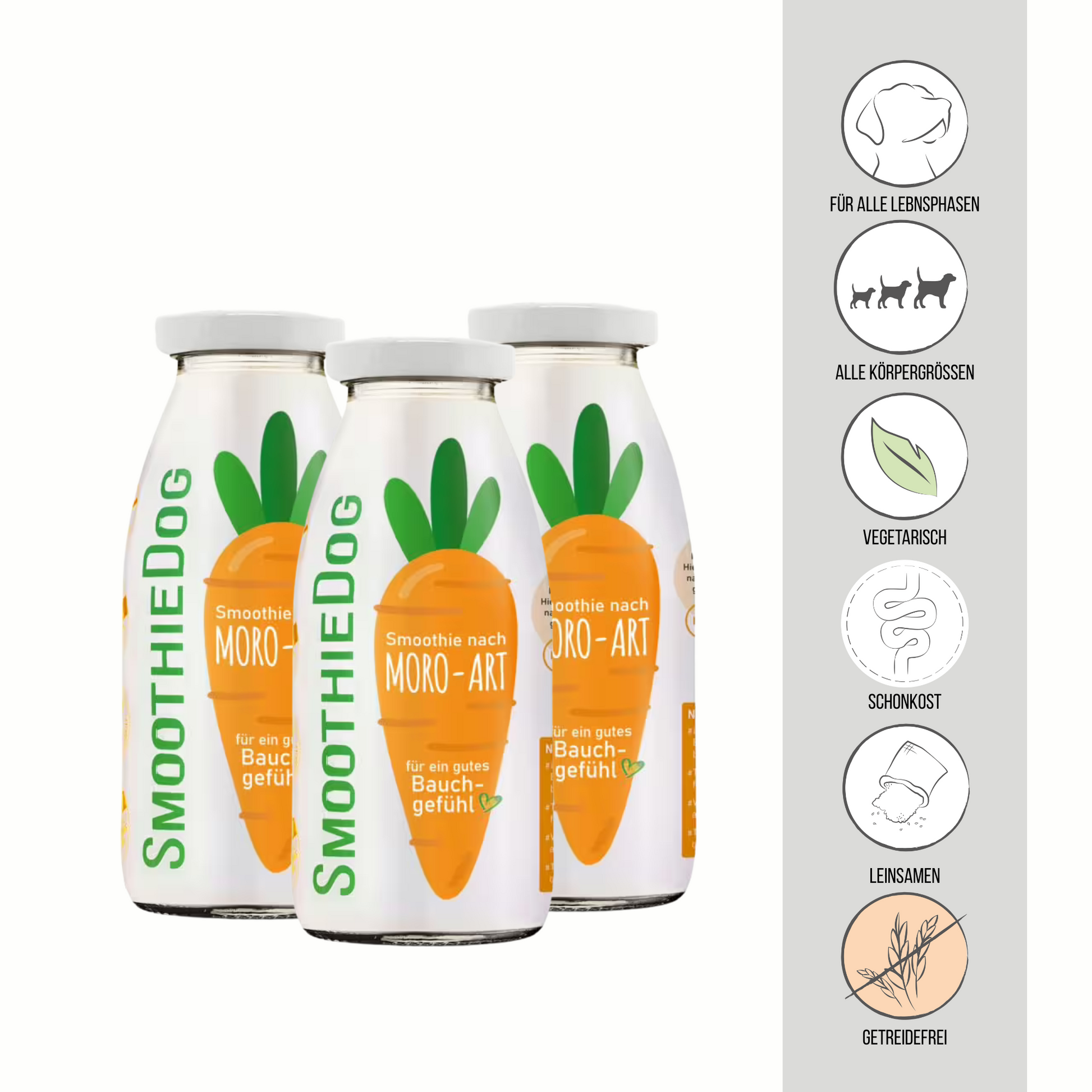 Moro Art Die bekannte und vegetarische Rezeptur der Moro'schen Karottensuppe kann Hunden bei Durchfallerkrankungen helfen und versorgt sie mit wertvoller Flüssigkeit und Mineralstoffen. Ergänzt wird der Smoothie durch Leinsamen und bietet somit die perfekte erste Hilfe bei Magen-Darm-Erkrankungen bei Hunden. Bei akutem Durchfall und Erbrechen sollte dem Hund die Morosuppe für 1-2 Tage mehrmals täglich angeboten werden. Ergänzt werden kann der Smoothie beispielsweise mit sehr gut verdaulichem gedünstetem mageren Hähnchenfleisch. Ab dem 2. bzw. 3. Tag kann der Smoothie auch wieder mit der Nahrung umgekehrt oder gemischt gefüttert werden, bis der Stuhlgang wieder stabil ist.