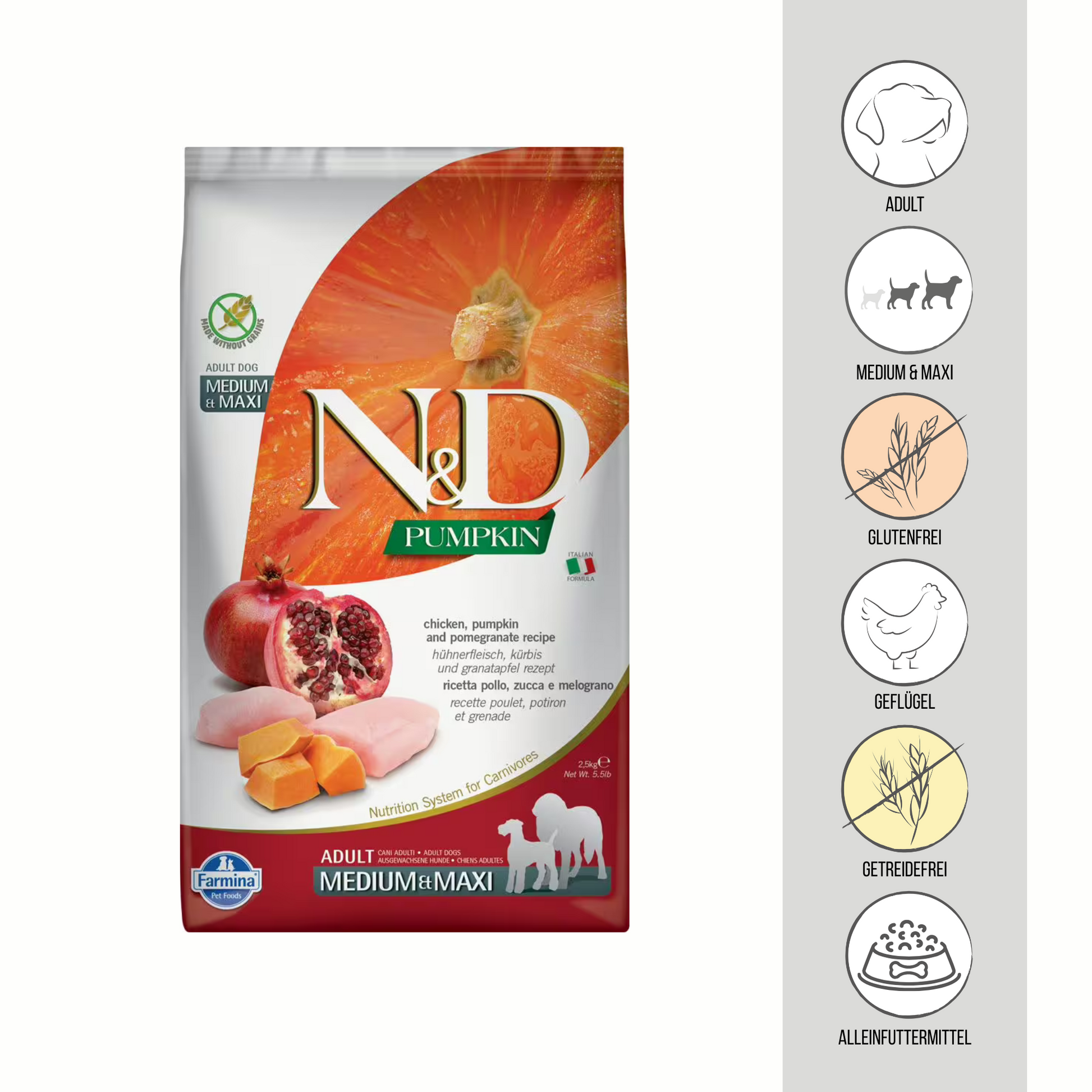 N&D Pumpkin - Adult Medium Maxi gibt es in 3 schmackhaften Sorten: